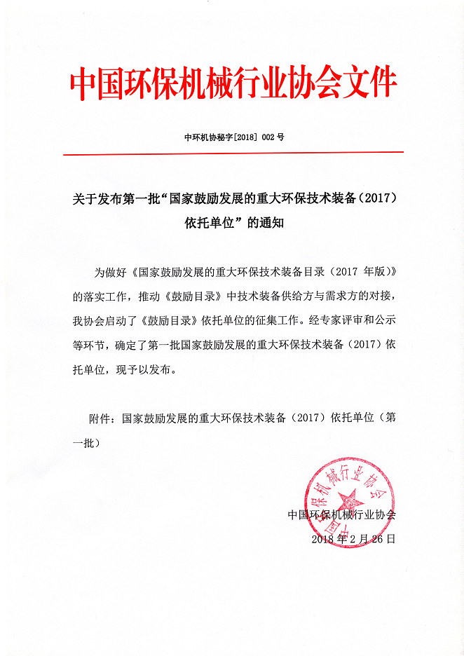 公司被列為“國家鼓勵發(fā)展的重大環(huán)保技術(shù)裝備(2017)依托單位”